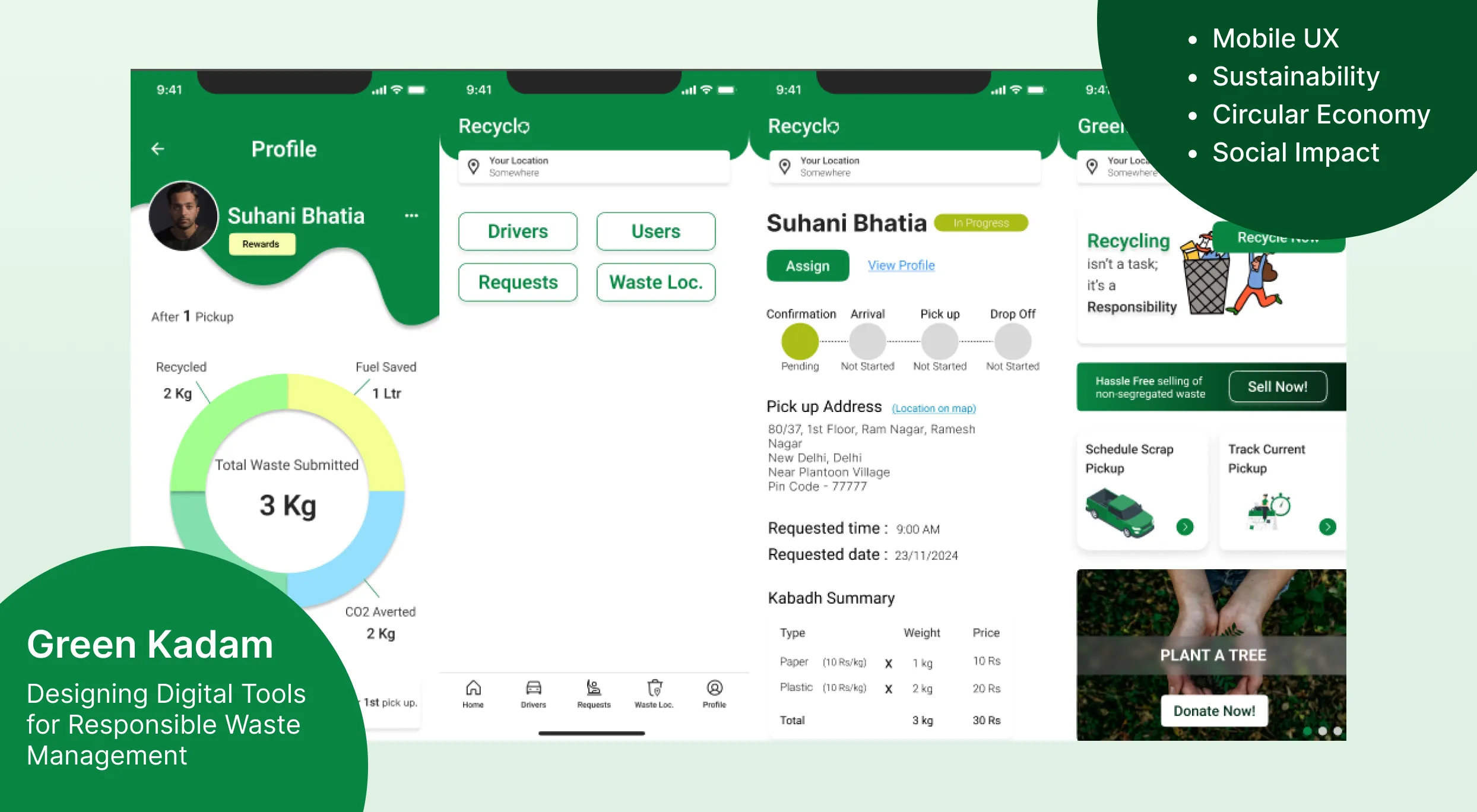 Urban waste management systems suffer from a critical lack of citizen participation at the source. Segregation of recyclables is often poorly understood, and the friction involved in locating verified recyclers prevents mass adoption. Municipalities manage waste retroactively, dealing with mixed refuse at landfills rather than capturing clean resources at the household level. The objective of GreenKadam was to entirely digitize and incentivize the consumer recycling journey.